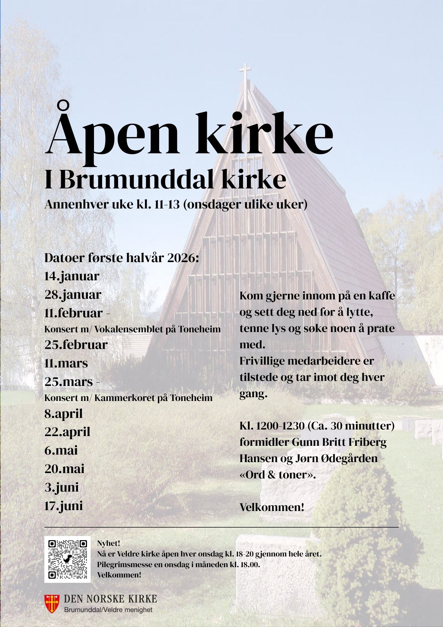Veldre kirke, onsdager kl. 18.00-20.00 (hver uke)